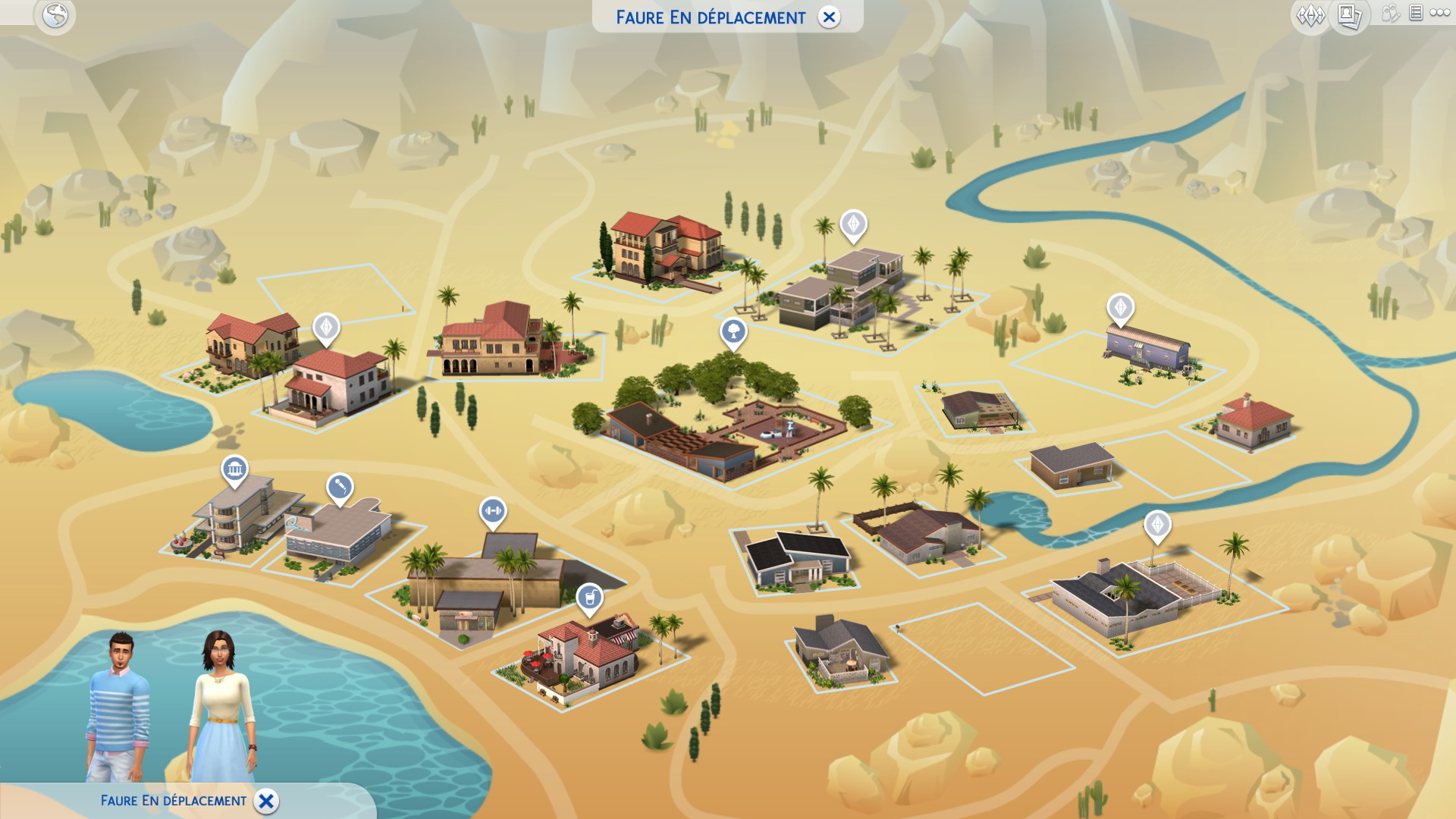 Fezet : Le lancement du jeu nous permet de voir que l’interface a bien évolué ! Les cartes en couleurs des différents mondes donnent au jeu un aspect plus fini, plus travaillé et aussi beaucoup moins triste. Des nombreux éléments de l’interface ont été revus, comme certaines icônes ou des menus. La barre de conversation (en haut de l’écran) en Mode Vie se voit relookée : fini les flèches pour passer d’un Sim à un autre, on peut désormais cliquer sur des miniatures, c’est bien plus parlant. On retrouve également un nouveau bouton en bas de l’écran qui donne accès à un gestionnaire de captures d’écran.